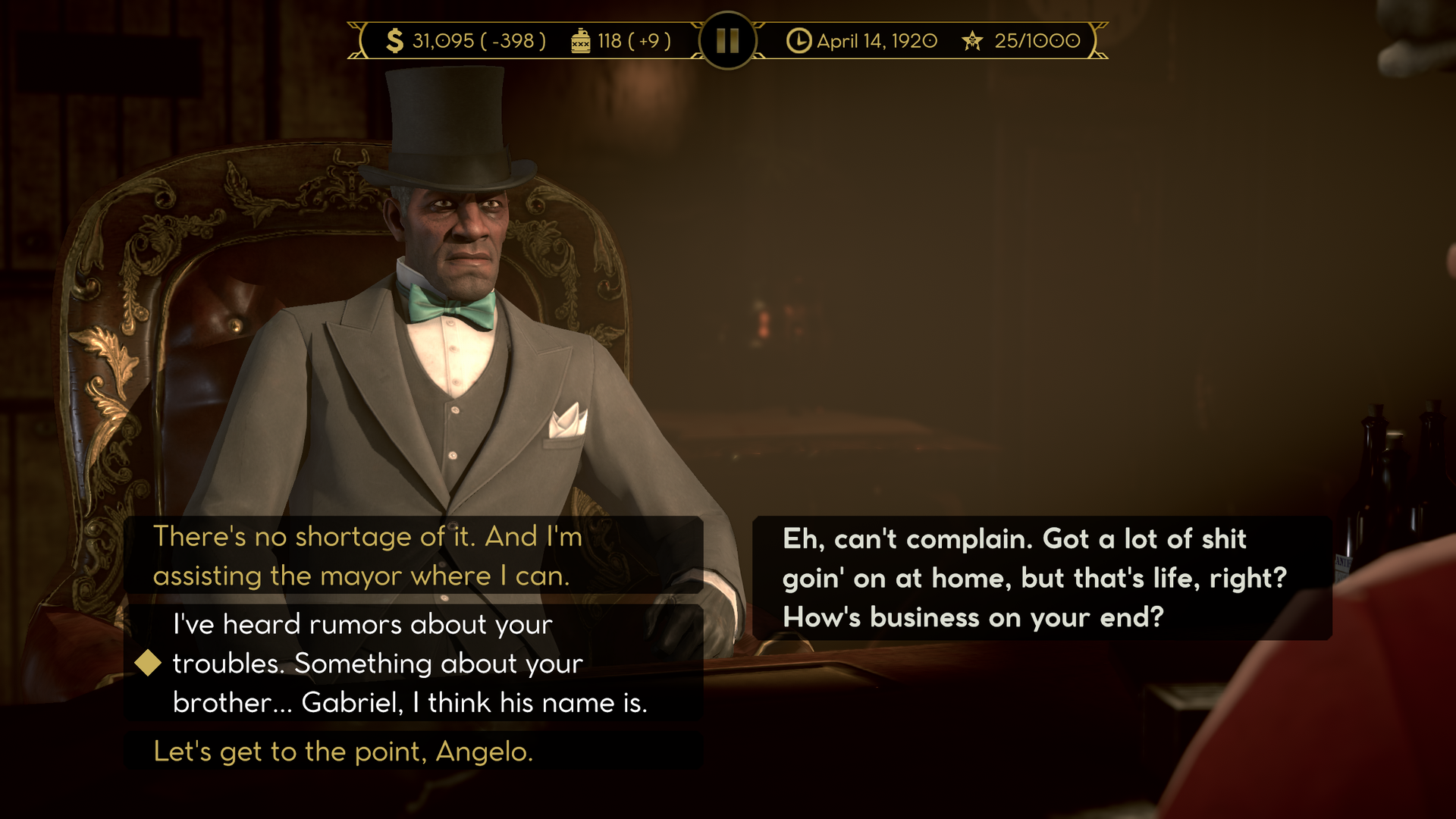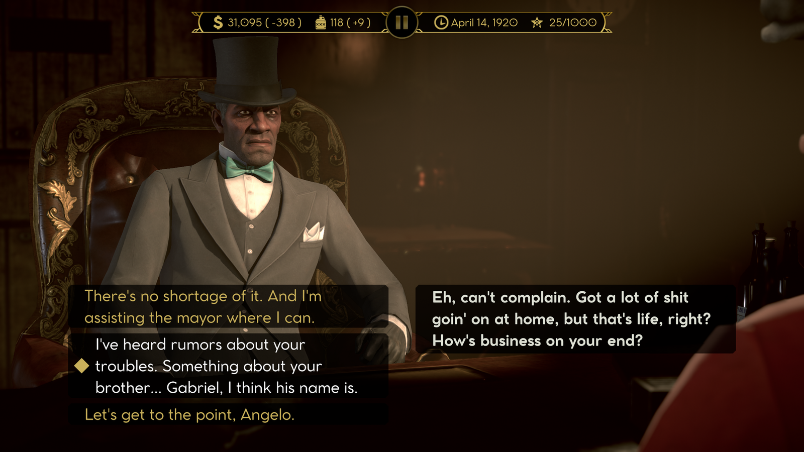 O enredo de Empire of Sin é muito bom. De fato, não é um jogo com uma história centrada e sim uma série de eventos protagonizados por diálogos intenso e pelas escolhas do jogador. Ou seja texto em si que torna a história legal.