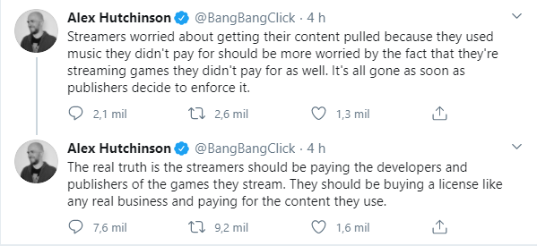 “Os Streamers estão preocupados com seus conteúdos sendo retirados por terem usado músicas que eles não pagaram, mas, de fato, eles deveriam estar preocupados com os jogos que eles não pagaram também. Tudo isso terá um fim assim que as publicadoras (dos jogos) decidirem controlar isso.” Disse Alex Hutchinson.