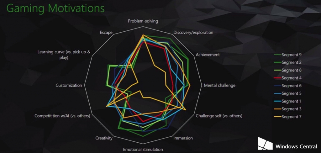 A Microsoft também abordou os grupos de foco e outras pesquisas com as quais teve experiência, discutindo as motivações e as razões que levam as pessoas a jogar. As informações do próximo quadro advêm de um banco de dados com quase 8 mil pessoas, através de quatro mercados. A Microsoft identificou “12 núcleos fundamentais”, que seriam os aspectos motivacionais para jogar e ainda descobriu 9 tipos distintos de jogadores que avaliam grupos de aspectos motivacionais de forma mais semelhante, em média.